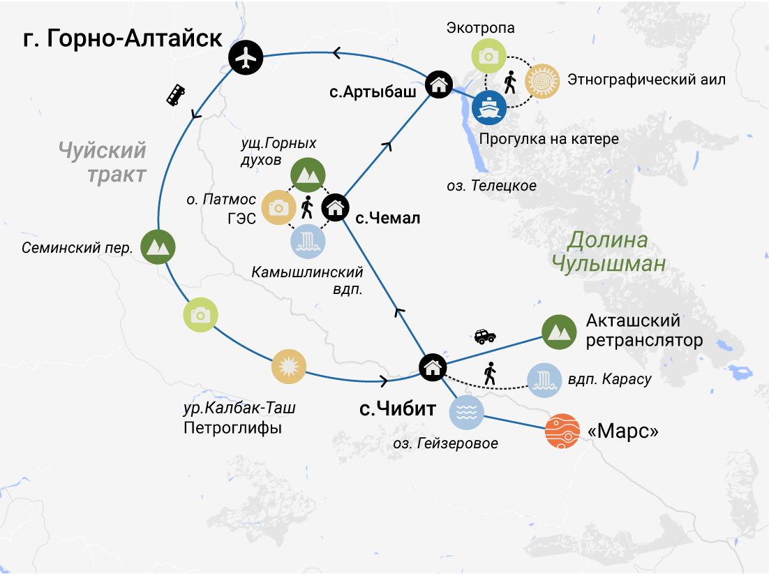 Тур короткий и очень насыщенный, так что вы сможете влюбиться в Алтай всего за неделю! Мы проедем по знаменитому Чуйскому тракту, увидим все знаковые места и прикоснёмся к культуре и истории Алтая. А в перерывах будем слушать рассказы гидов и знакомиться с изысками алтайской кухни.