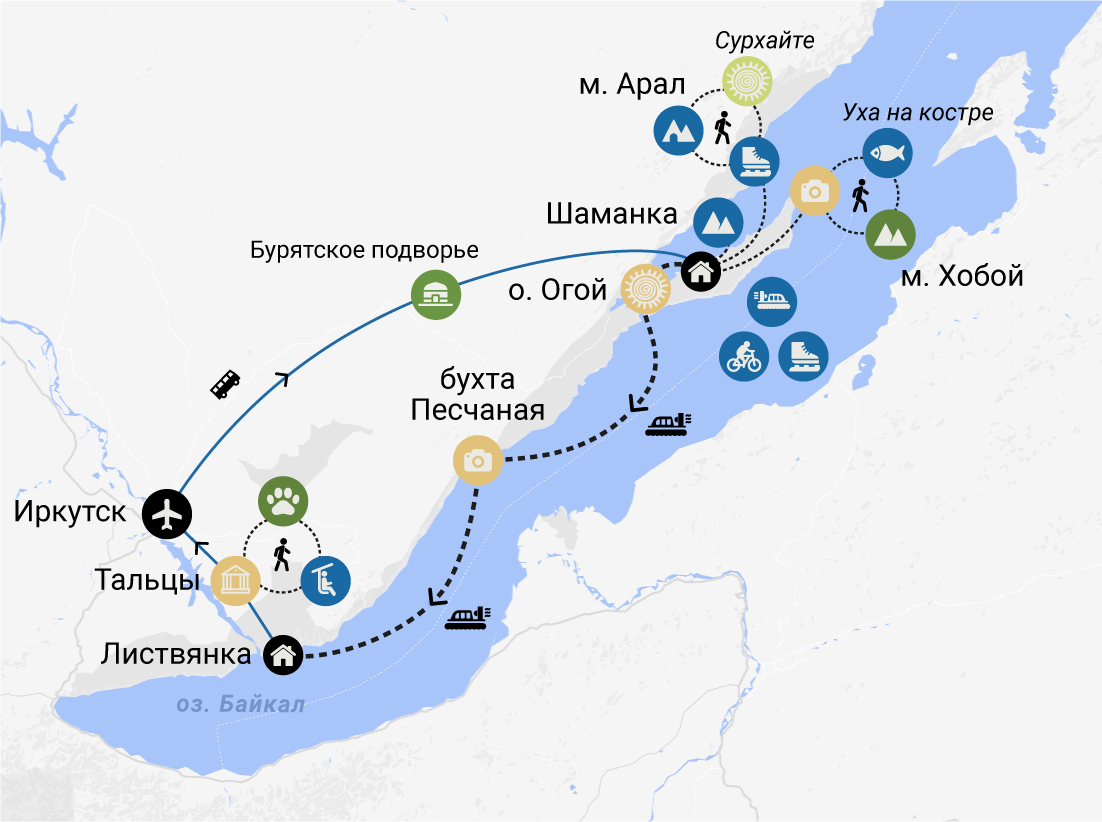 А ещё нас ждёт сюрприз! Мы заедем на фестиваль ледовой скульптуры Olkhon Ice Fest, который проводит наш руководитель региона Байкал! Здесь лёд превращается в настоящие произведения искусства под руками талантливых скульптуров. Мы побываем в ледяной сказке с драконами, феями и шаманскими духами. А желающие смогут поучаствовать в мастер-классе по созданию ледяной скульптуры.