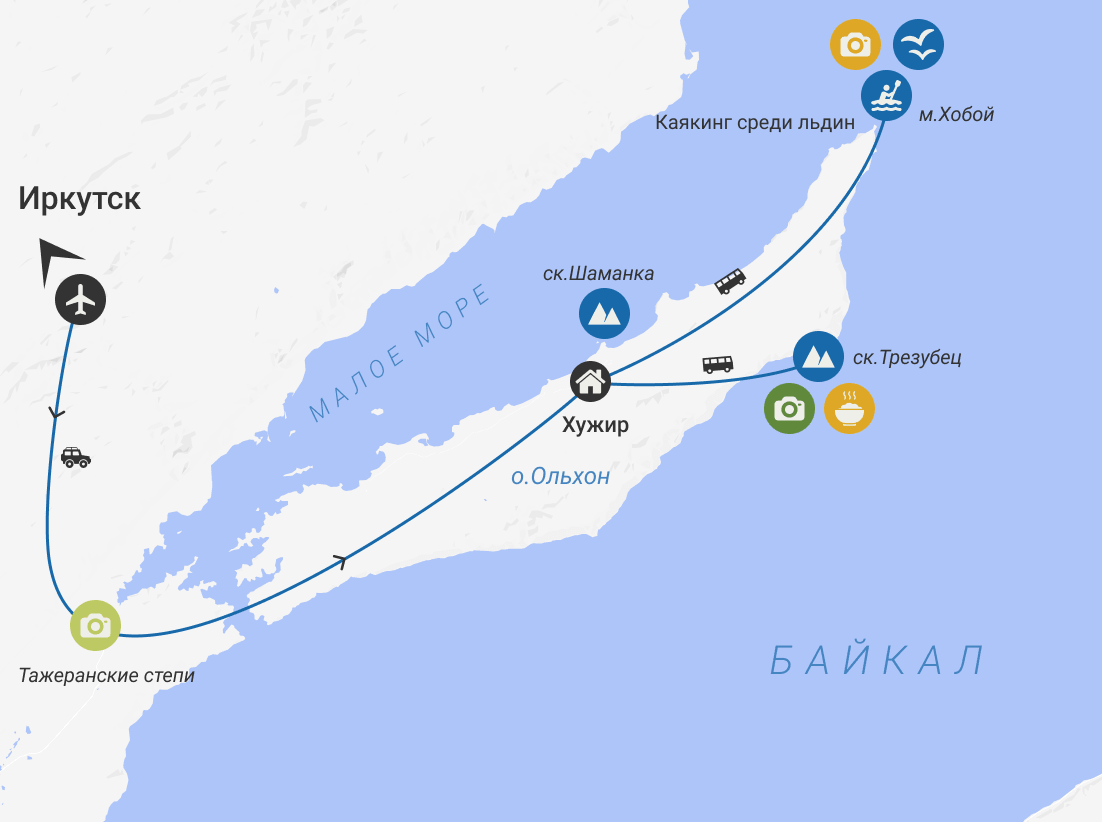 Мы встретимся в Иркутске (подробнее в разделе «Место и время встречи группы») и на джипах по Тажеранским степям отправимся в сторону Ольхона. Нам предстоит преодолеть больше 300 км. В Тажеранских степях мы увидим небольшие горы, пещеры и даже древние петроглифы. Поднимемся на видовые точки и заглянем в уединенные бухты на берегу Байкала. Затем на пароме переправимся на Ольхон и заселимся в гостиницу в п. Хужир.