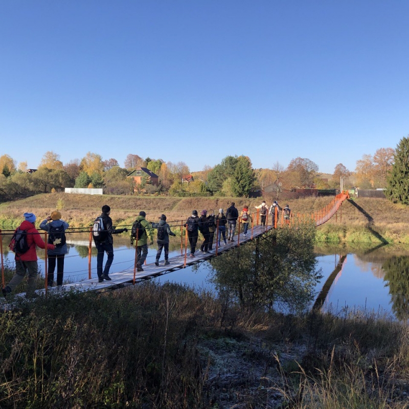 Утром встретимся на станции Тучково (подробнее в разделе «Место и время встречи») и проедем немного на автобусе. Затем перейдём по живописному подвесному мостику через Москву-реку. Освежимся чистой и вкусной водой в деревне Игнатьево. А потом мы выйдем в поле, где на красивой опушке сделаем остановку для фото. После заходим в лиственный лес и, немного петляя по тропинкам среди деревьев, выйдем к небольшому озерцу с красивыми березками на берегу, где делаем первый привал на перекус.