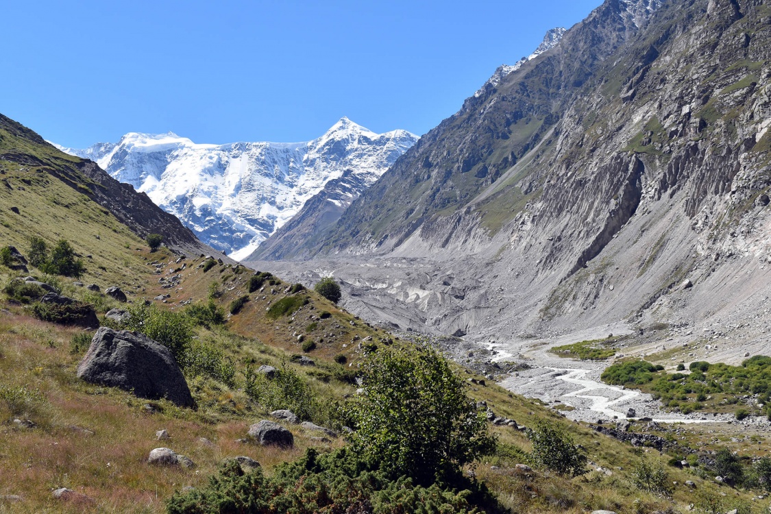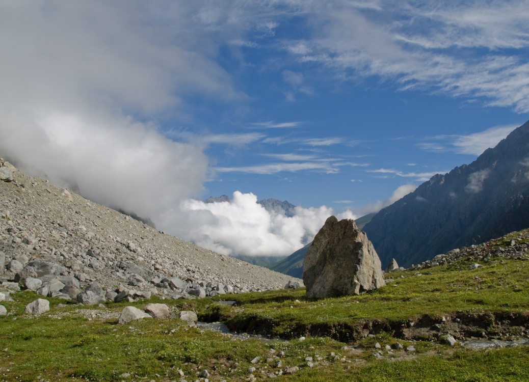 Сегодня — небольшая прогулка для акклиматизации и привыкания к высоте. В этих местах хорошо ощущается холодное дыхание Безенгийского ледника, вдоль которого мы прогуляемся по экотропе. Природа здесь богата ягодами, и, возможно, в августе нам удастся полакомиться черникой и брусникой. Перейдём на другой берег реки и поднимемся к водопаду Жигинджи. В лучах восходящего солнца брызги водопада отливают золотом и серебром. Полюбуемся причудливыми струями и восхитимся видом на пик Брно (4 100 м), возвышающийся напротив нас.