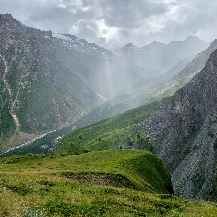 Сегодня мы прогуляемся к леднику Мижирги по моренной тропе. По пути пройдём ещё один красивый водопад — Гидан. После указателя «Тёплый угол» доберёмся до ущелья Укю — очень популярного места среди альпинистов. Затем дойдём до Поповских ночёвок. Нам откроется вид на Северную стену и мощный ледник с его пятитысячными вершинами Дыхтау и Мижирги. Самое время сделать перекус и насладиться величественными видами. Контраст альпийских лугов, голубого неба и высоченных снежных склонов впечатляет.