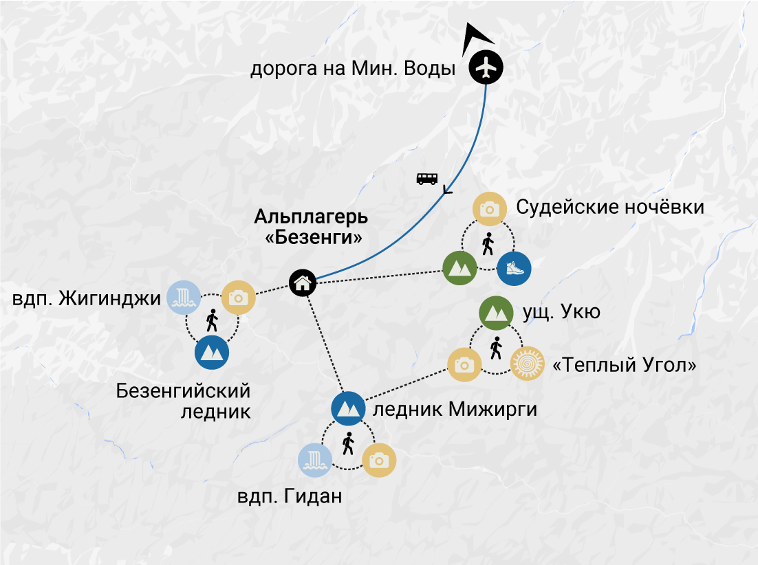 В этом путешествии все треккинги налегке и нет ночёвок в палатках. Живём в гостевых домиках альплагеря «Безенги» в 2-3-местных номерах с удобствами.