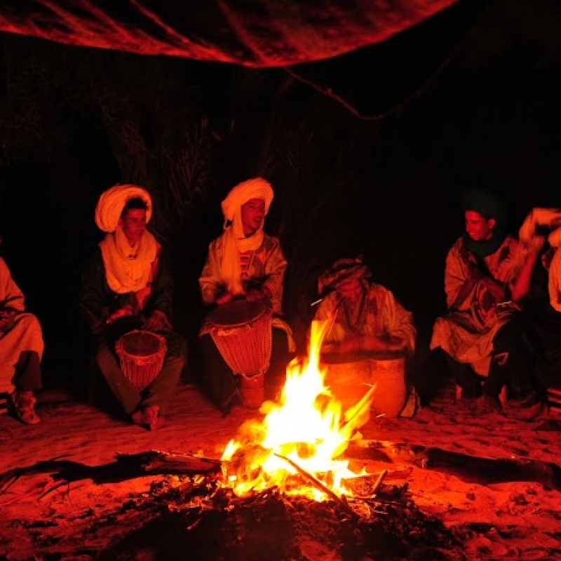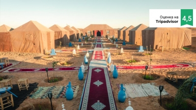 Сегодня нас ждёт необычная ночёвка прямо в пустыне! Только представьте: бескрайние песчаные просторы, сытный традиционный ужин, ритмичные звуки барабанов, зажигательные танцы у костра и бесконечное небо, усыпанное яркими звёздами… На ночёвку разместимся в традиционных берберских шатрах-палатках (на территории имеются комфортабельные туалеты, есть электричество, лобби-зона).