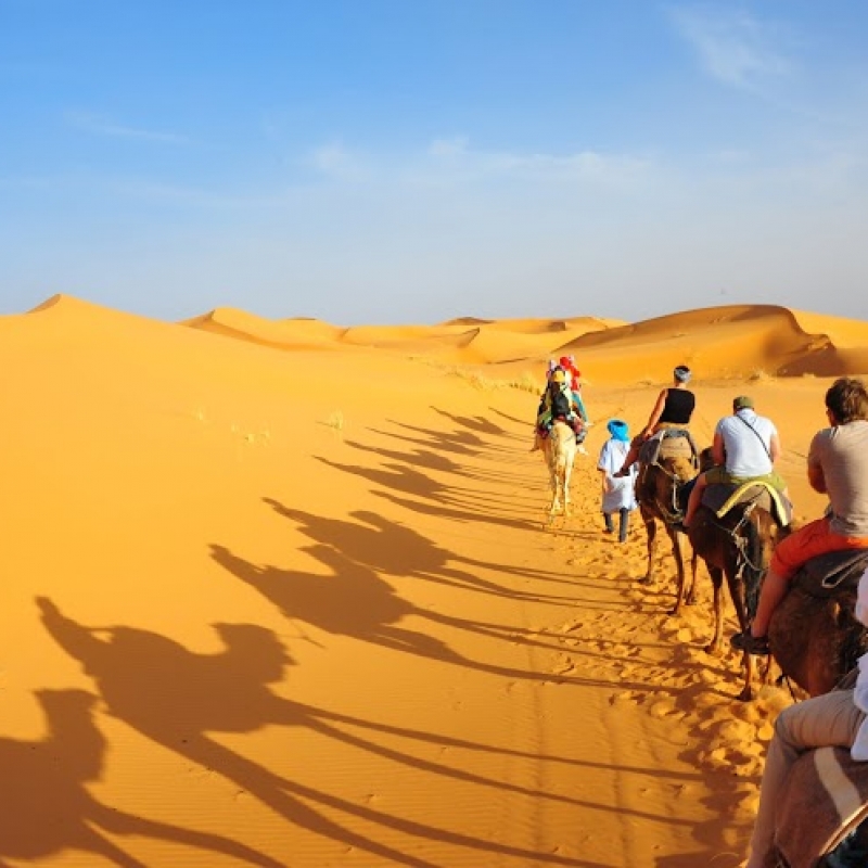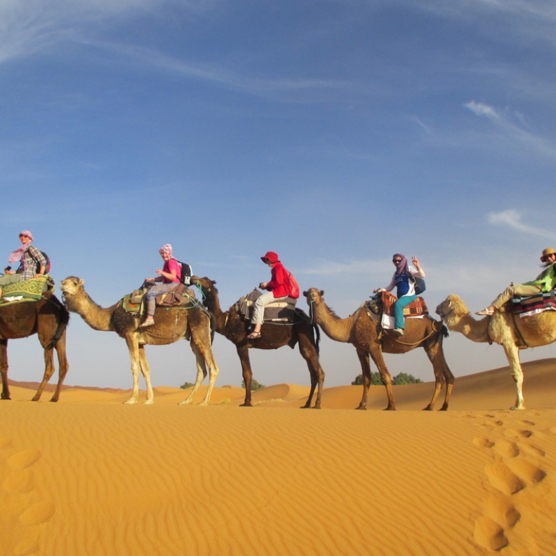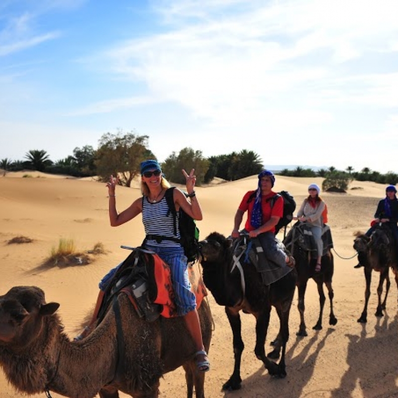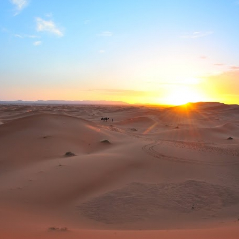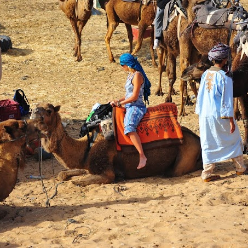 По пути пообедаем и отправимся к нашей цели на сегодня — в пустыню Сахара. Сначала доедем до небольшой деревеньки Мерзуга, где пересядем на верблюдов. Наш караван отправляется в пустыню. Нашими проводниками будут туареги — это одна из немногих народностей на планете, которая сохранила свою уникальность и самобытность. Эти высокие и статные люди — настоящие жители пустыни, которые живут по своим традициям: например, в их народе царит матриархат, а мужчины должны закрывать лицо платком.