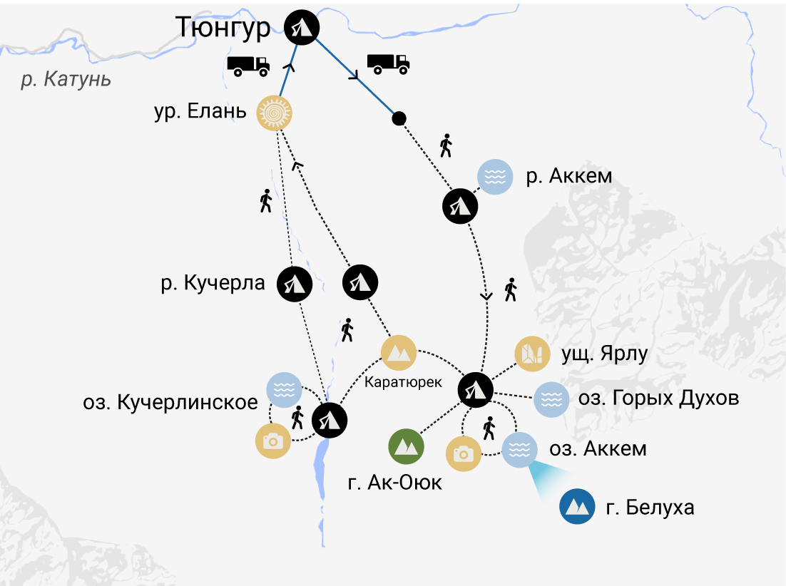 Наш маршрут проходит через живописную долину Аккем и долину Семи озёр. Мы увидим высокогорные озёра Аккем и Кучерлинское, бурные реки Кучерла и Белуха, разноцветные горы долины Ярлу.