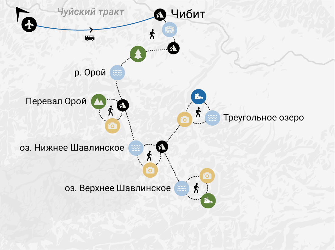 С Семинского перевала мы полюбуемся восхитительными видами на вершины Алтая. В путешествии нас ждут живописные долины рек Шавла и Шабага, снежные вершины гор Сказка, Мечта и Красавица и конечно же, чистейшие бирюзовые Шавлинские озёра. Во время радиальных выходов мы поднимемся к Верхнему Шавлинскому и Треугольному озёрам.