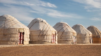Ближе к вечеру поедем на большое солёное озеро Айдаркуль, раскинувшееся в восточной части пустыни Кызылкум (для заездов с мая по сентябрь). На ночь остановимся в экзотическом месте — юрточном лагере — и почувствуем себя настоящими кочевниками. Приготовьтесь встретить необычный закат: мы поднимемся на песчаный бархан и увидим, как солнце медленно садится за горизонт, окрашивая всё вокруг в розовые тона. Затем поужинаем и соберёмся у костра посмотреть выступление акына — так здесь называют народного поэта и певца.