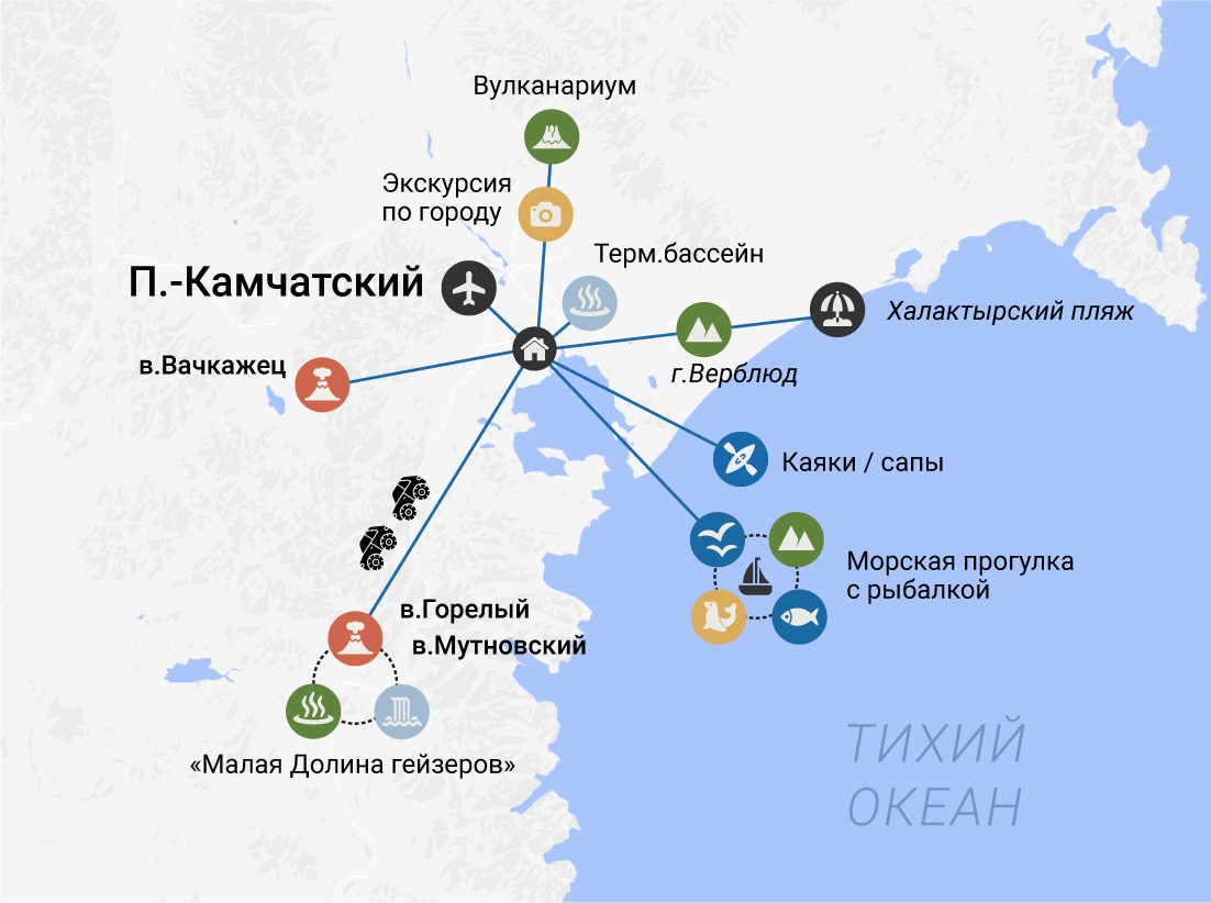 Также предусмотрен свободный день, в который вы можете заказать вертолётную экскурсию в Долину гейзеров или к Курильскому озеру.