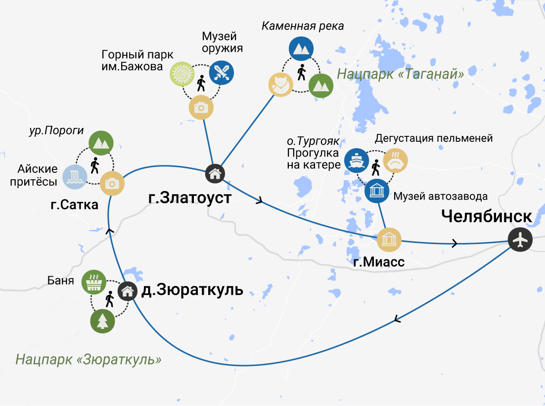 Это лёгкий и комфортный тур по Южному Уралу, после которого можно будет смело ставить галочку «Выполнено» на вашей карте путешествий :) Мы посетим самые известные и знаковые достопримечательности: горное озеро Зюраткуль, воспетый в песнях хребет Таганай, город мастеров Златоуст и знаменитый горными богатствами Миасс. Мы увидим и прекрасные горные пейзажи, и бескрайние степи Башкирии, и роскошные закаты на озерах, и старинные улицы городов, и, конечно, почувствуем неповторимую атмосферу, связанную с многочисленными поверьями, сказками и легендами. Чтобы ещё глубже погрузиться в уральскую культуру, посетим несколько музеев, заглянем на производство и осмотрим лучшие городские локации во время экскурсий.