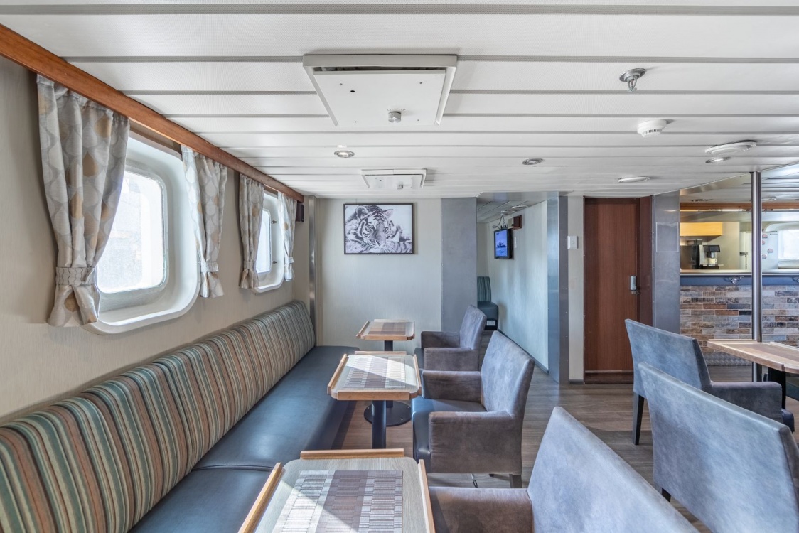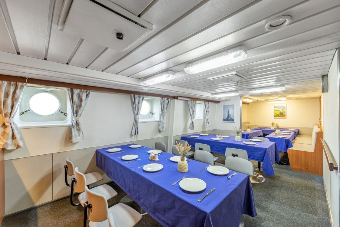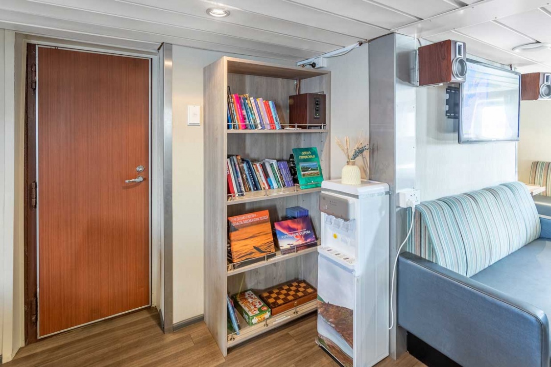 Для удобства пассажиров на борту есть несколько классов кают, 2 ресторана, бар, сауна, кинозал, кают-компания, библиотека с большой коллекцией тематической литературы, конференц-зал, комната отдыха.