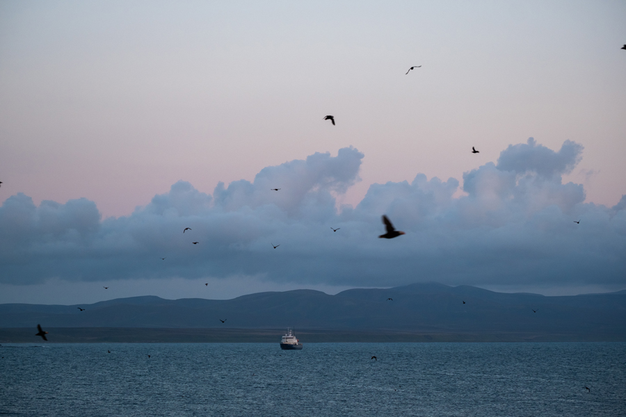 В первый день тура участники встретятся в порту Анадыря (подробнее в разделе «Место и время встречи»), пройдут регистрацию на рейс. Около 14:00 теплоход «Академик Шокальский» выйдет в Анадырский залив и возьмёт курс на юг. После на корабле организуют приветственный обед. А за бортом можно будет с большой вероятностью заметить белух и птиц, сопровождающих суда.