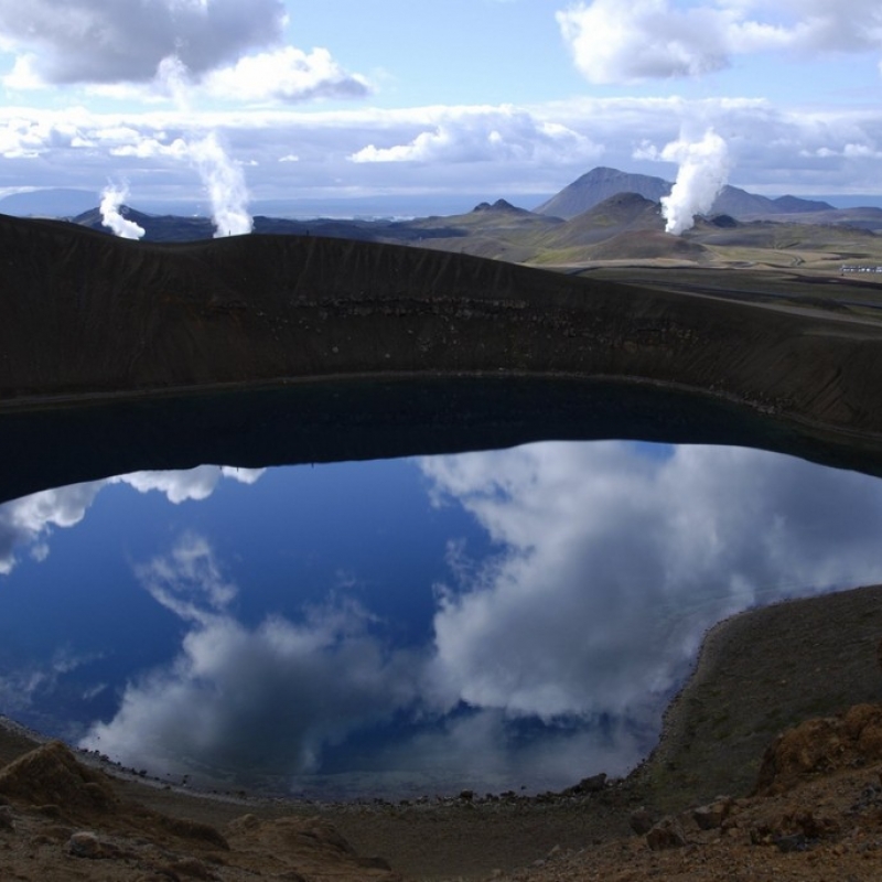 Вторая половина дня посвящена путешествию по вулканической стране чудес Миватн. Это яркий оазис на краю пустынного высокогорья Исландии. Чёрная лава здесь чередуется с кратерами, реками, озёрами и горами, а зелёные холмы сменяются серными насыпями. Такой странный ландшафт образовался благодаря вулкану Крафла. Бассейн с горячей магмой находится под землёй, а мы на поверхности можем наблюдать следы его активности: горячие источники, грязевые кратеры и множество разломов. Центр активности приходится на кальдеру Стора-Вити, которую ещё называют «ад». Она заполнена бирюзовой и изумрудной водой. Мы пройдём по тропе вокруг основания вулкана, посмотрим на бассейны с кипящей грязью и горячий источник молочного цвета.