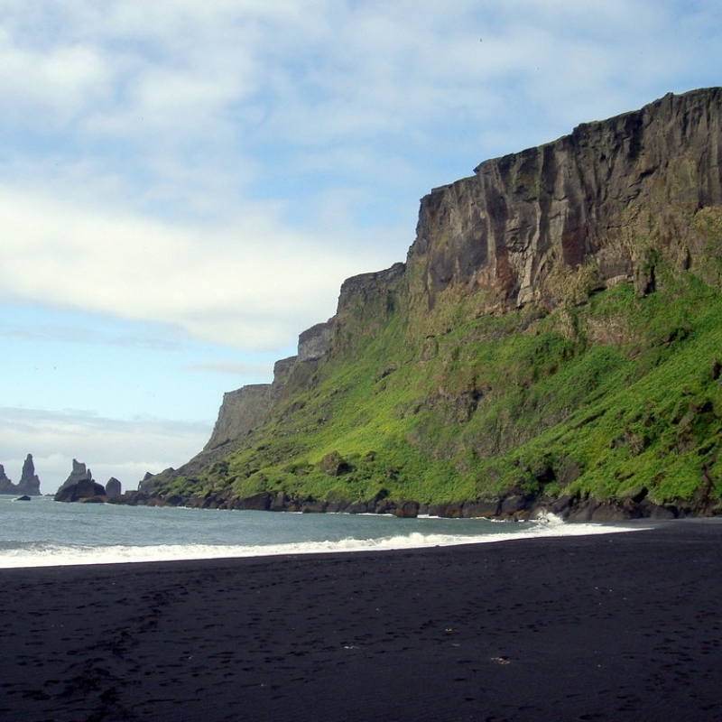 После этого отправимся на чёрный песчаный пляж в деревню Вик. Американский журнал «Острова» назвал этот пляж самым красивым на Земле. Песок здесь стал чёрным в результате вулканической активности: лава во время извержения влилась в океан, остыла, а потом разбивалась водой. С пляжа видны красивые базальтовые колонны в море.
