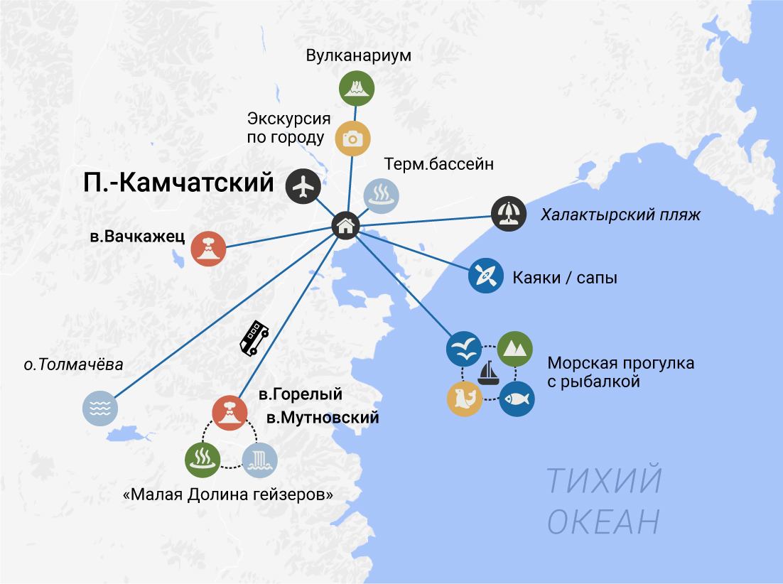Также предусмотрен свободный день, в который вы можете заказать вертолётную экскурсию в Долину гейзеров или к Курильскому озеру.