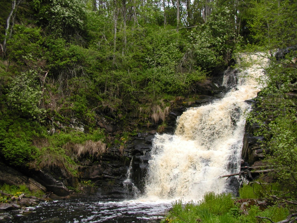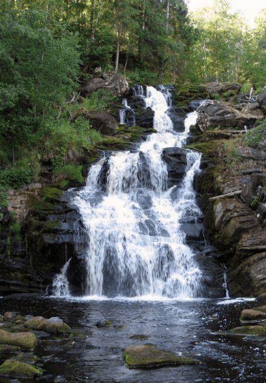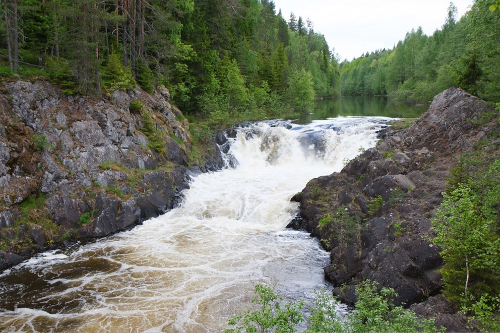 Далее дорога к лесному водопаду на реке Тохмайоки. Потоки воды падают в каменную чашу среди сосен и елей — это одно из самых живописных мест южной Карелии.