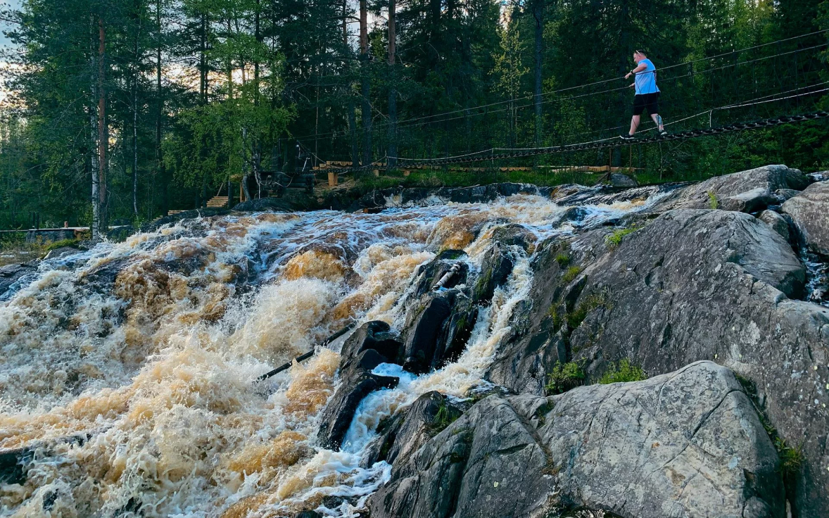 День начнётся с завтрака и возможности заглянуть на форелевую ферму за свежими деликатесами. Далее вас ждёт путь к Белым мостам — самому высокому водопаду Южной Карелии. Это скрытое от большинста туристов место впечатляет мощью: поток воды здесь падает с 17-метровой высоты.