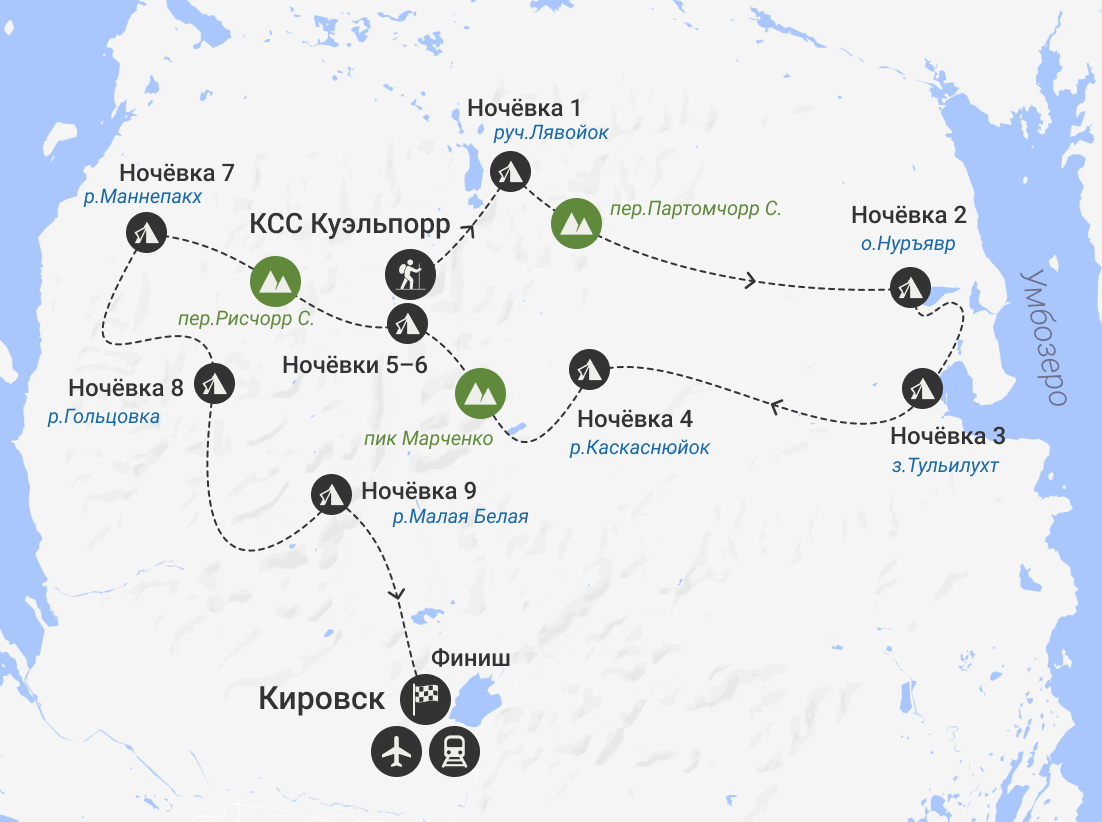 Утром встреча участников похода в Кировске (подробнее в разделе «Место и время встречи»). Далее — групповая заброска до базы Куэльпорр, в самое сердце национального парка Хибины! Нас ждёт автопутешествие по горам и даже рекам.