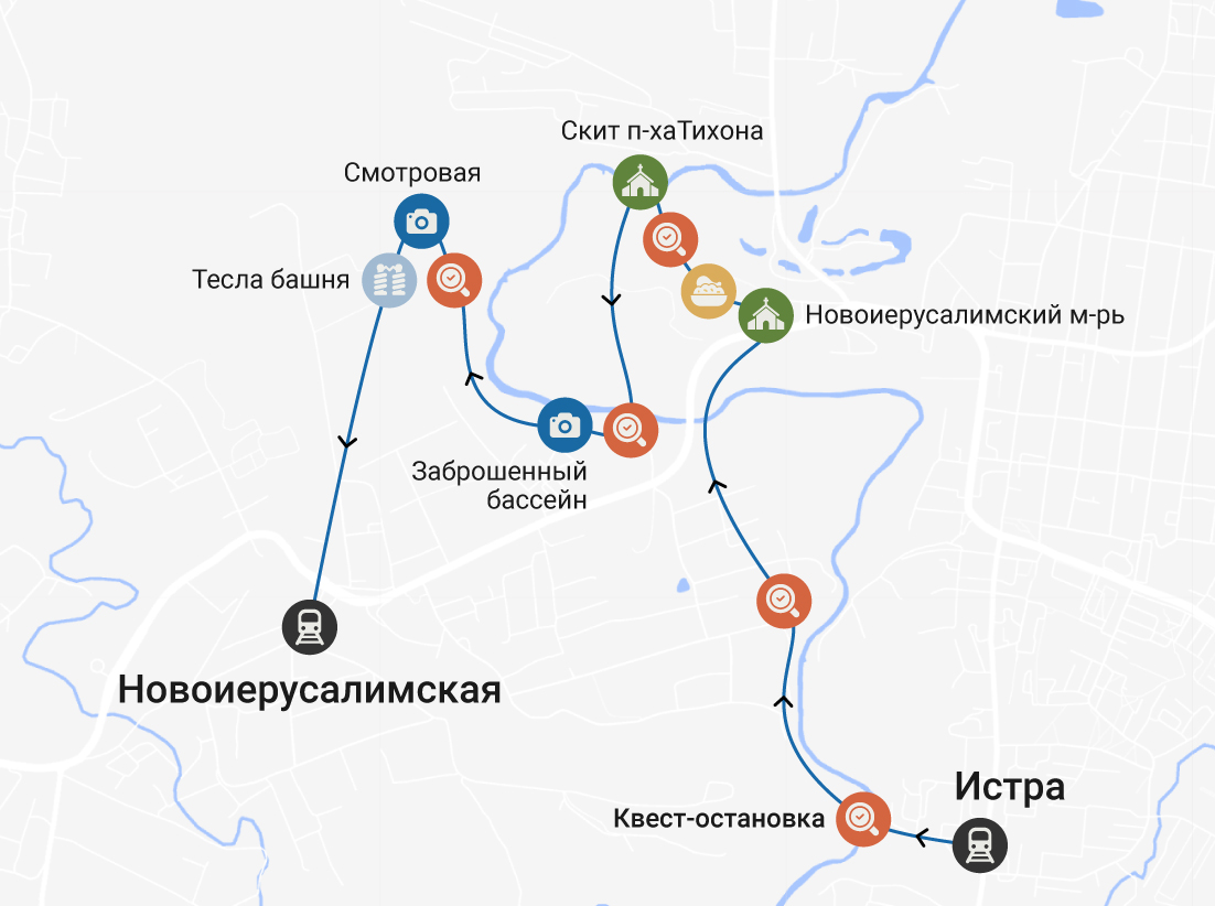 Город Истра находится в тихом зелёном районе на северо-западе от Москвы. Рядом – река Истра и холмы, поросшие лесом, а главная достопримечательность здесь – Новоиерусалимский мужской монастырь. Во время квеста участники узнают городские легенды Истры и тайны монастыря, посетят заброшенный бассейн, который стал настоящим арт-объектом. А ещё погуляют вдоль реки и поднимутся на гору с панорамным видом на монастырский комплекс. Ну, а самый загадочный объект будет ждать в финале прогулки... ;)