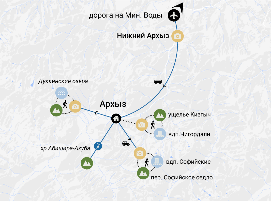 Участники встретятся в Минеральных Водах (подробнее в разделе «Место и время встречи»), вместе заедем в кафе на обед (оплачивается дополнительно) и после отправимся в посёлок Архыз.