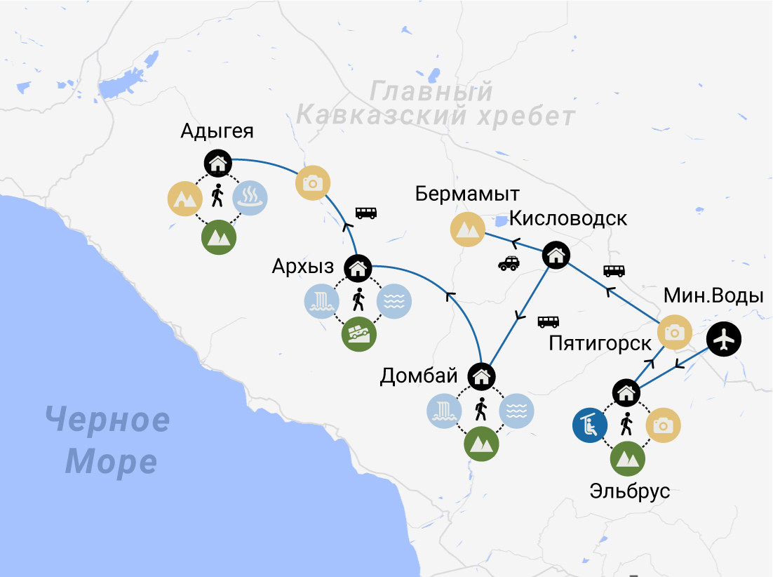 За 7 дней мы посетим три республики и два края, прикоснёмся к тайнам древности и узнаем десятки легенд. Начнём наш маршрут по Кавказу с Минеральных Вод и финишируем в Адыгее. Нас ждут увлекательные экскурсии и живописные прогулки!