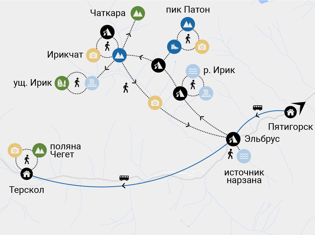 Для этого тура НЕ ТРЕБУЕТСЯ специальной подготовки и оборудования (кошки, ледорубы и проч.). Походное снаряжение: рюкзак, треккинговые палки и ботинки — можно взять напрокат в Пятигорске.
