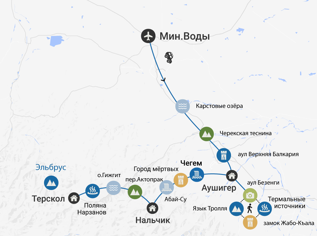 Для того, чтобы увидеть суровую красоту Северного Кавказа, необязательно брать длинный отпуск, ведь в этом путешествии целый чемодан впечатлений поместился в одно компактное 5-дневное путешествие! Мы успеем посетить сразу четыре самых красивых ущелья Кабардино-Балкарии и Приэльбрусья, побродить по старинным аулам, увидеть «Замок людоеда», бирюзовые озёра и, конечно, величественный Эльбрус!