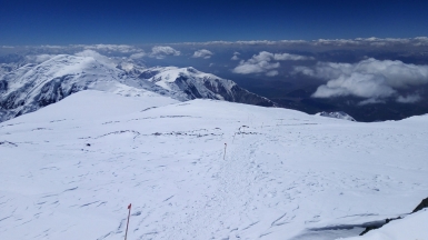 Сначала траверсом выйдете к седловине. Здесь много опасных участков в виде закрытых трещин. Дальше продолжите идти вверх до гребневого плато.
