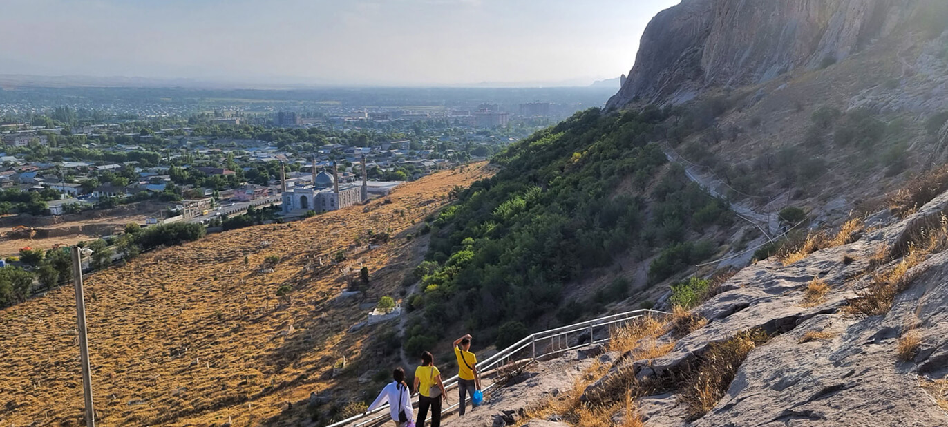 Также есть возможность отправиться на священную Сулейман-гору. Подняться на её вершину, расположенную на высоте 1092 метра, можно примерно за полчаса по лестничной тропе. Со смотровой площадки открывается великолепный вид на весь Ош. Здесь вы увидите развевающийся флаг Кыргызстана и домик потомка Тамерлана. Особое очарование горе придаёт её расположение прямо в центре города. А если подниметесь ближе к закату, перед вами раскроются самые живописные виды.