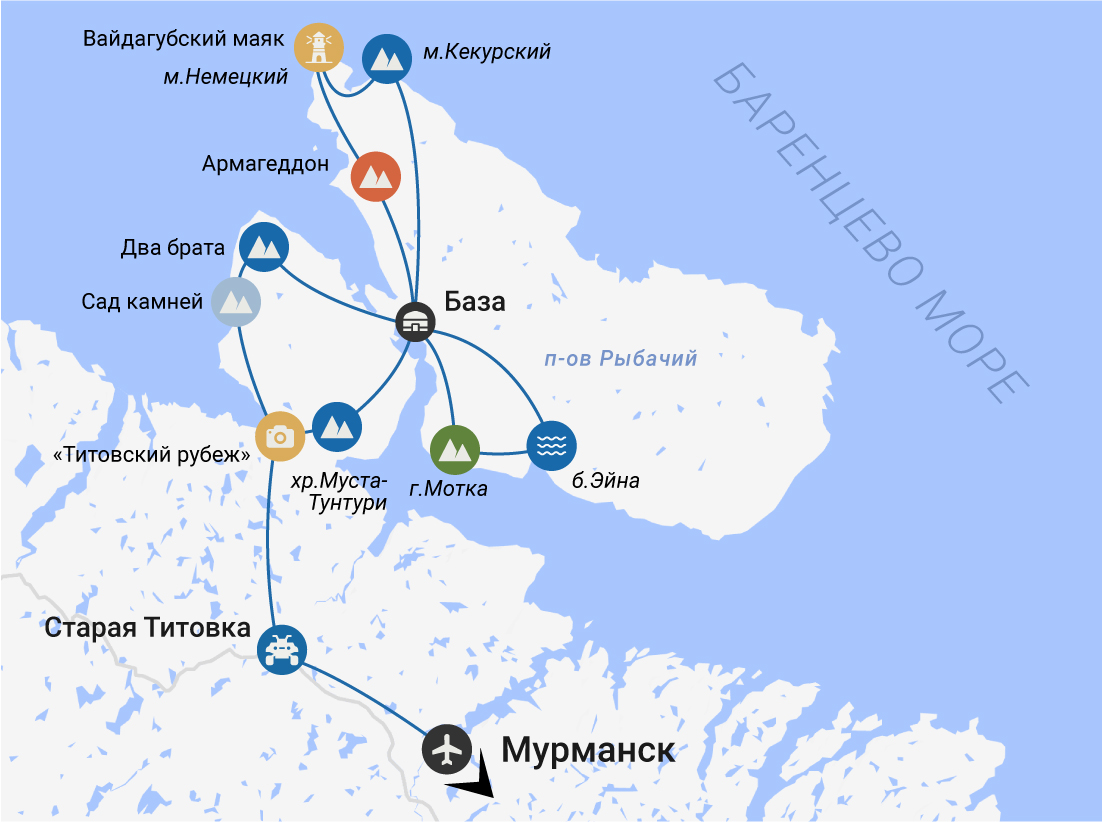 Сегодня нас ждёт маршрут: Два брата — Сад камней — береговая артиллерия — Старая Титовка — Мурманск.