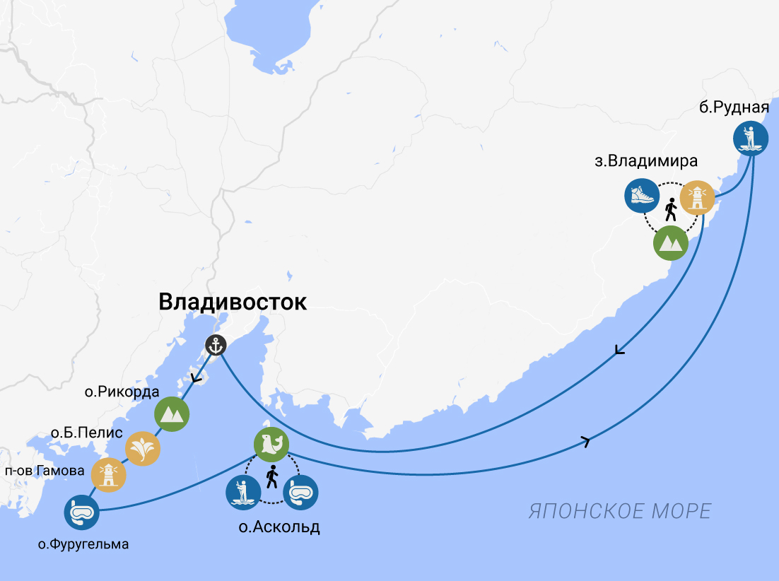 Нас ждёт продуманная до мелочей программа и сплочённая команда гидов, мастерски выполняющая свою работу. Мы исследуем старинные маяки и пройдём нехоженными тропинками по необитаемым островам, искупаемся в райских бирюзовых бухтах с белым песком и нырнём с аквалангом, послушаем увлекательные лекции учёных и фотографов и вместе с шеф-поваром приготовим пойманные собственными руками морские деликатесы. И, конечно, не упустим возможность познакомиться с экзотическими обитателями дальневосточного побережья: тюленями, сивучами, редкими птицами и жителями подводного мира.