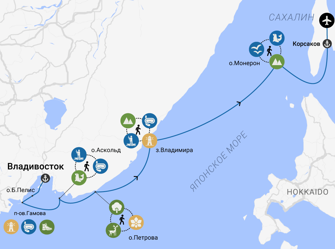 В этом необычном круизе за неделю вы пройдёте от Владивостока до Сахалина по прозрачным водам Японского моря. Каждый день — новый остров или залив! Вы посетите заповедные бухты, скалистые мысы и места, которые хранят в себе память прошлых столетий. Понаблюдаете за вальяжными сивучами и суетными птичьими базарами, увидите редкие японские растения, а ещё сможете сами понырять с аквалангом и убедиться, что разнообразие подводного мира Дальнего Востока не уступает тропическим берегам.