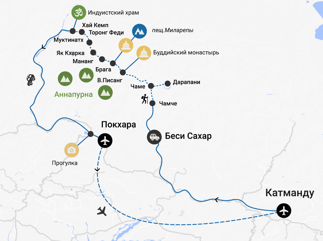 Сразу после перевала нас ждёт другая культура и другая атмосфера. Мы окажемся в Муктинатхе — месте, куда тысячи паломников приходят к священным источникам. Здесь, среди монастырей и храмов, можно по-настоящему почувствовать, как переплетаются индуизм и буддизм.