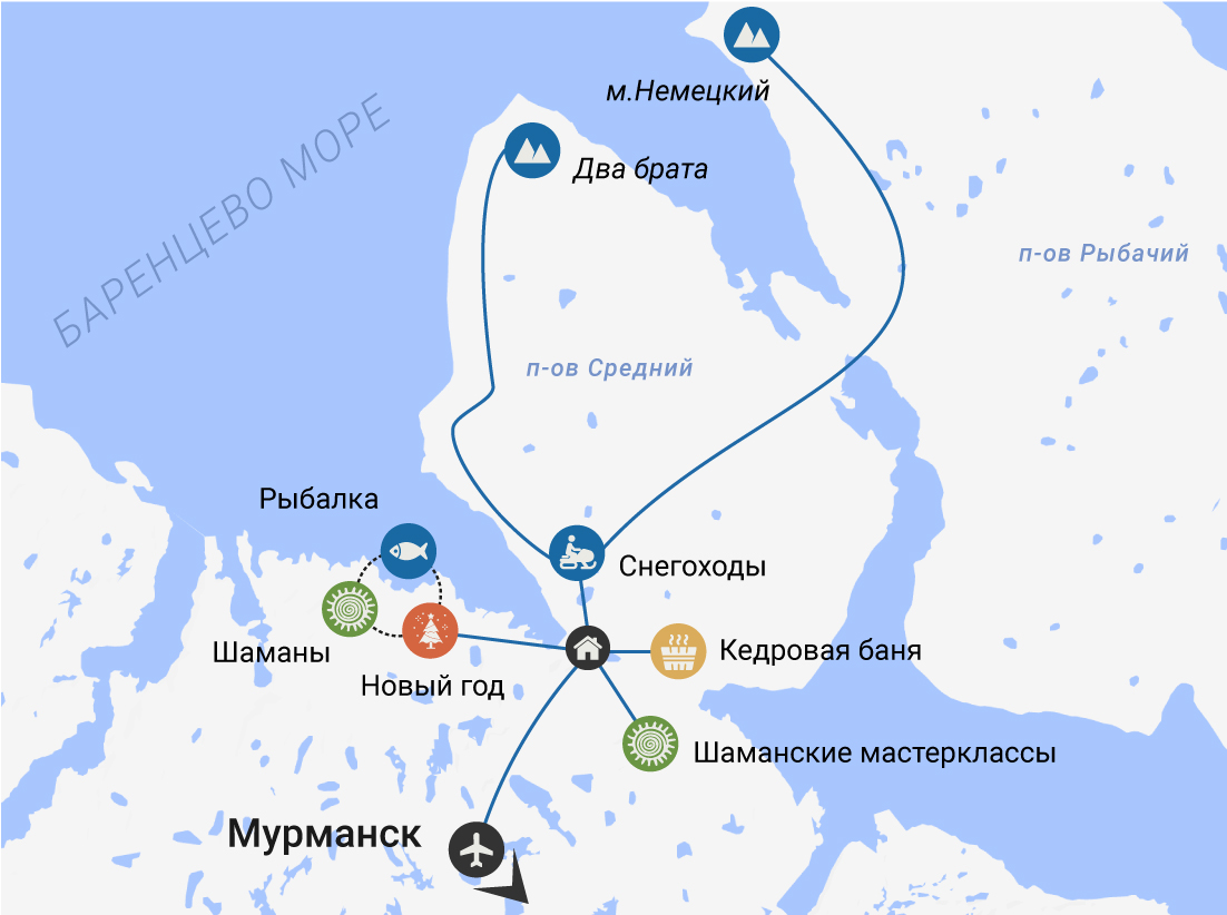 Сегодня нас ждет сафари на снегоходах к полуостровам Средний и Рыбачий, которые омываются Баренцевым морем. Здесь можно попробовать на вкус солёный морской воздух и сделать фото необычных арктических пейзажей. Первым на пути будет полуостров Средний, который знаменит сейдами Два брата и Берег рыжих камней — древние священные камни, почитаемые саамами. На полуострове Рыбачий заедем на два мыса. Мыс Немецкий — это самая северная точка Европейской части России. А с высокого берега Кекурского мыса можно бесконечно наблюдать за бушующей мощью северного моря. Вам остаётся только выбрать, на какой из двух полуостровов вы будете заезжать.