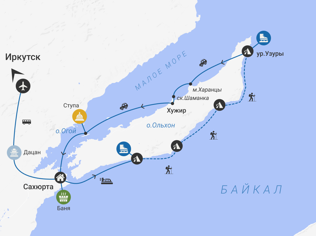 Этот поход для любителей зимы и настоящих приключений! Мы будем проходить до 18 км в день, ночевать в палатке и исследовать окрестности священного острова Ольхон. Наш маршрут пройдёт по нетуристическим местам, и потому мы увидим зимний Байкал во всей его первозданной красоте: первыми ступим на чистейший лёд и преодолеем мощные торосы Большого моря, заглянем в нетронутые ледяные гроты и в звенящей тишине встретим морозные алые рассветы. А ещё покатаемся на коньках, попробуем строганину из рыбы сиг, а байкальского омуля – прямиком с горячей коптильни! На маршруте не будет мобильной связи, а потому полная перезагрузка от информационного шума обеспечена!
