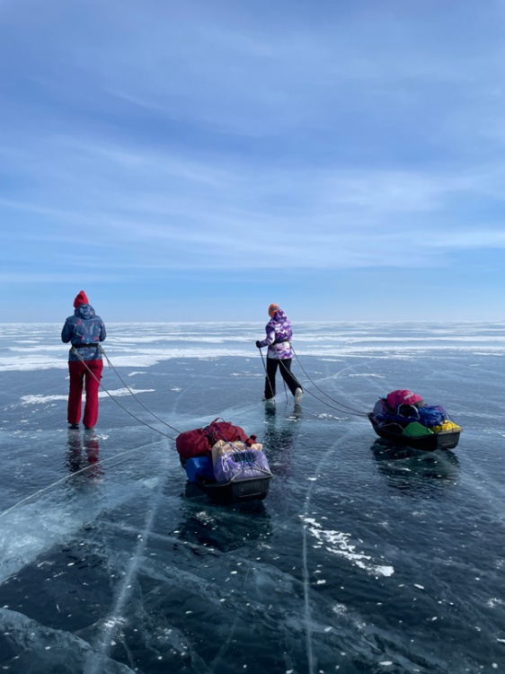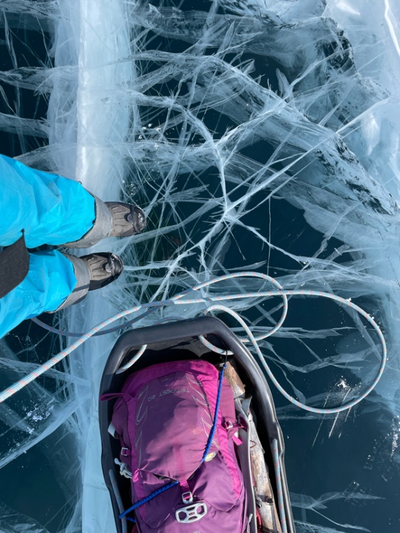 Сегодня первый ходовой день! Для более комфортного и безопасного передвижения по льду каждый участник получит ледоступы, которые крепятся на подошву обуви, и треккинговые палки. А вещи погрузим на сани-волокуши, которые крепятся за упряжь к специальному ремню. Идти с такими волокушами легко, груз практически не чувствуется.
