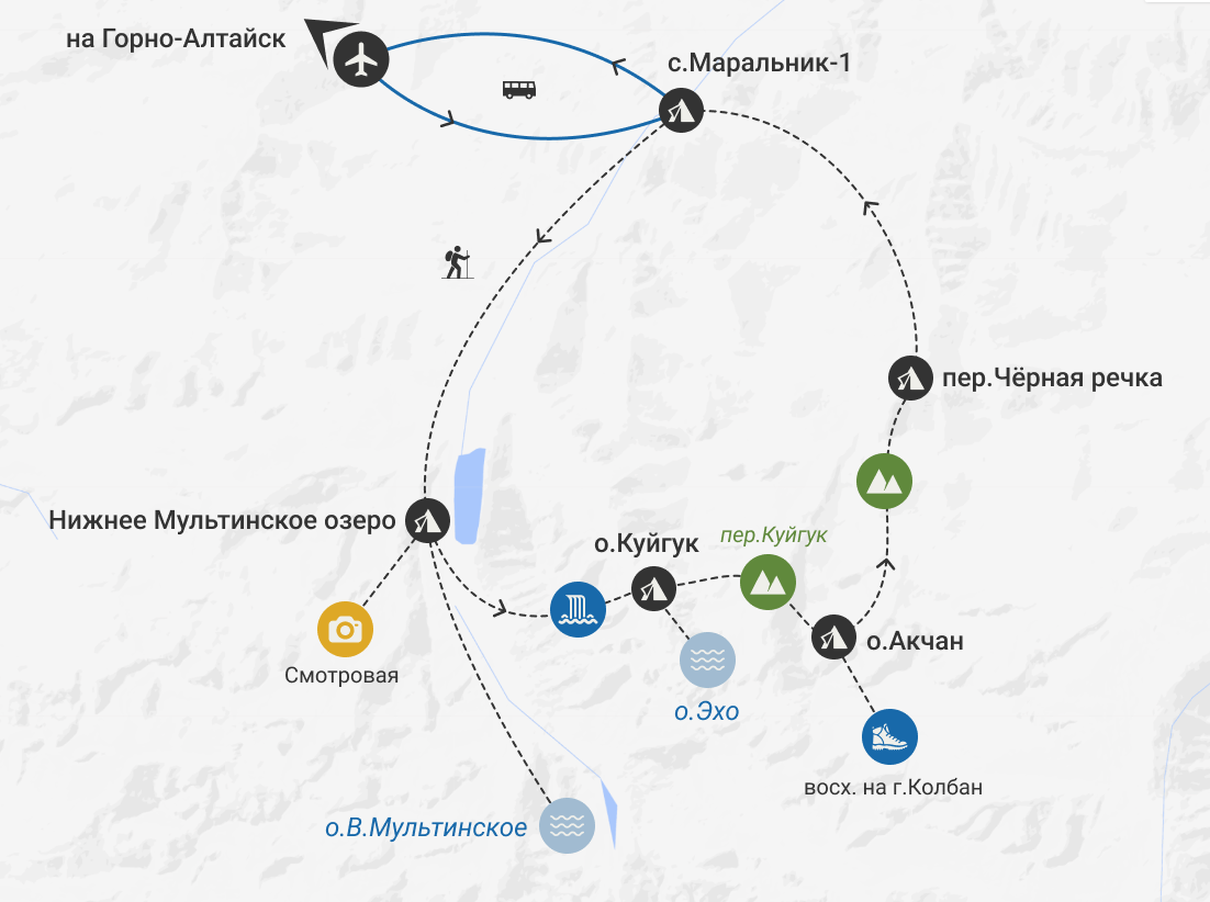 Для участия в этом приключении обязателен походный опыт! Маршрут не будет простым: нас ждёт переход через перевалы Куйгук (1А, 2 520 м) и Чёрная речка (2 100 м), восхождение на гору Колбан (3 150 м) и смотровую над Мультинскими озёрами (2 500 м). Ну, и традиционные для таких путешествий: ночёвки в палатках, походная кухня, вечера у костра, холодные броды через речки, купание в прозрачных ледяных озёрах и водопадах. А главная награда — преодоление себя и полная 11-дневная перезагрузка среди оглушительной красоты Алтая.