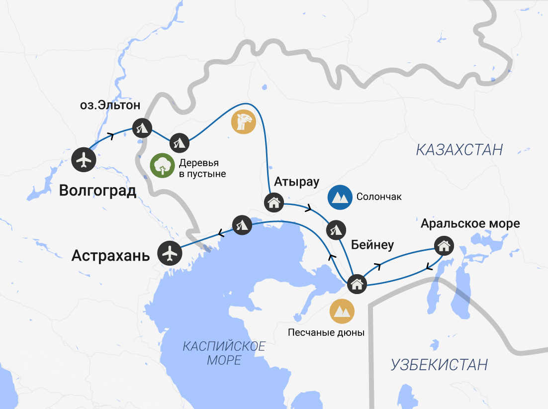За девять дней мы преодолеем около 3000 километров, проедем по территориям двух государств — России и Казахстана. Наш путь будет пролегать по местам, которые много лет назад были дном гигантского моря, соединявшего Каспий и Арал. Длинные поездки на машинах будут чередоваться пешими прогулками по самым живописным локациям. Пейзажи будут постоянно меняться: песчаные барханы уступят место степным равнинам, а за ними последуют уникальные растения, мхи и травы, животные и птицы.