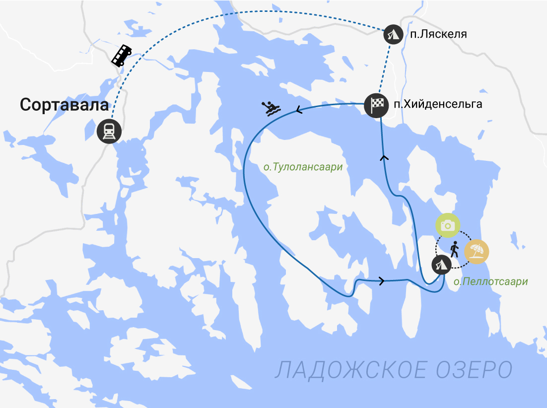Далее — знакомство, завтрак, инструктаж по технике безопасности и базовое обучение правилам поведения на воде. Затем нас ждёт переход на каяках до нашего лагеря. Сначала мы поплывём по спокойной реке Янисйоки, а примерно через пять километров выйдем на просторы Ладожского озера. Мимо Ладожских шхер доберёмся до острова Пеллотсари. Остановимся на ночевку на песчаном пляже в окружении могучих сосен.