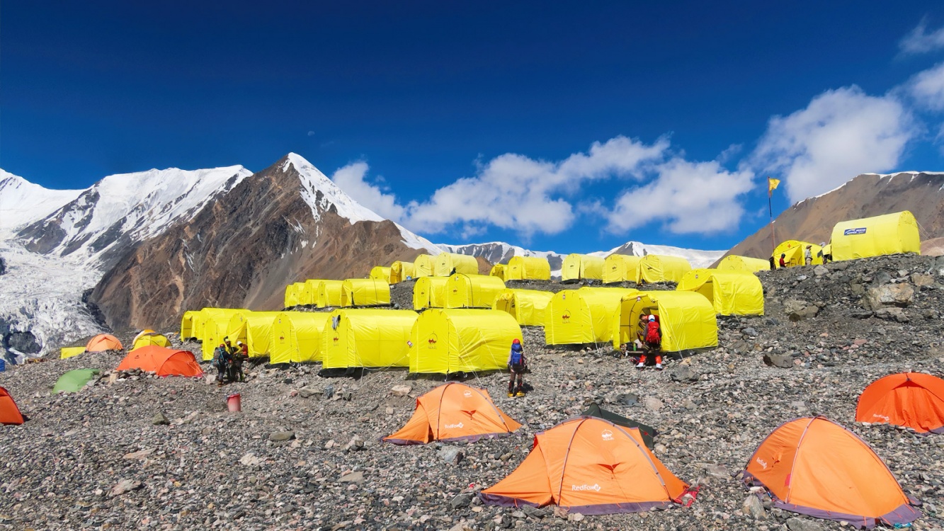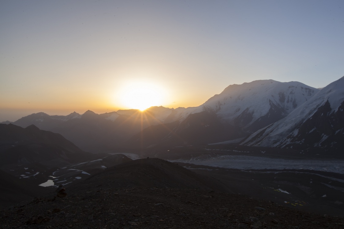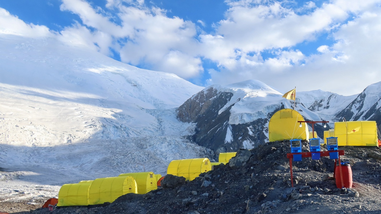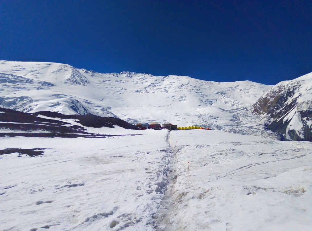 Сначала преодолеете перевал Путешественников, а после — выйдете на горизонтальную плоскость, тянущуюся вдоль моренного отвала. Пройдя горную реку, продолжите путь по леднику до лагеря «Солнечный», который расположился прямо на морене. Здесь так же уютно и гостеприимно, как и в базовом лагере, а для ночёвки установлены довольно просторные палатки с деревянными настилами. Размещение, акклиматизация и восстановление сил.