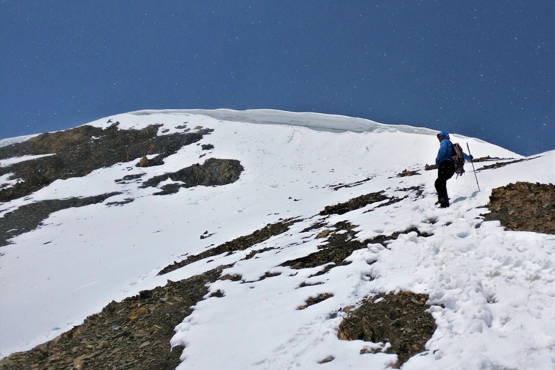 Сначала преодолеете гребень морены ледника Ленина, затем кулуар, ведущий прямиком на пик. Здесь будут участки с достаточно крутыми подъёмами, снегом, мелкой и средней осыпью. Здесь, на высоте 5 000 м, вы сможете вдохнуть полной грудью морозный горный воздух и застыть на мгновенье, наслаждаясь моментом.