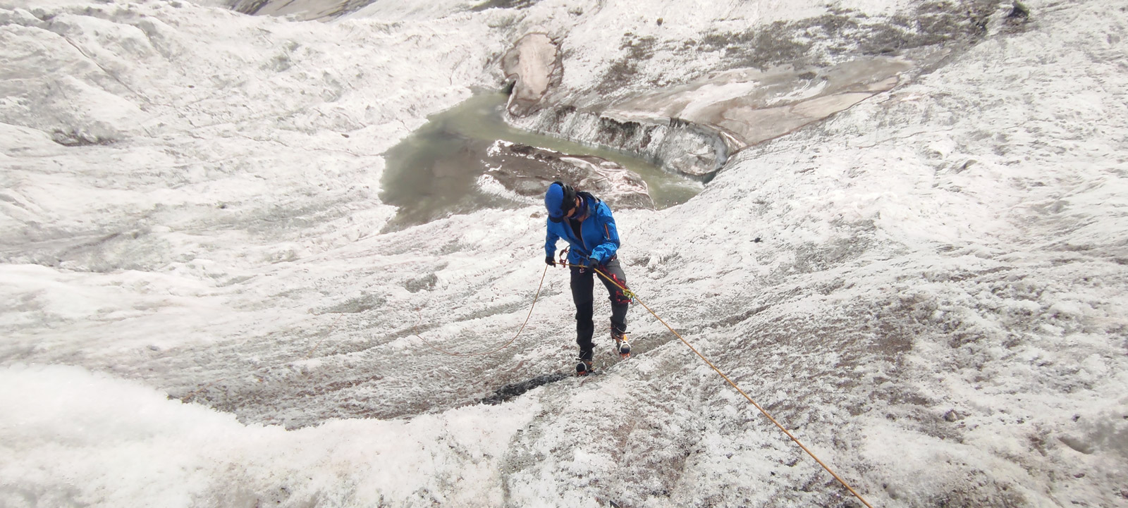 Сегодня вас ждут снежно-ледовые занятия. На них гид научит вас двигаться по разным типам ледников, преодолевать трещины, подниматься и спускаться по закреплённой верёвке, передвигаться в связках и кошках и приёмам самоспасения.