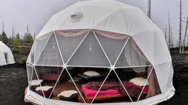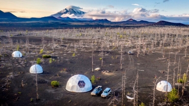 3 ночи мы проведём вдали от цивилизации в районе Толбачинского вулкана, фантастическом месте, где последнее извержение произошло всего несколько лет назад. Вы можете выбрать подходящий вам вариант заезда с размещением в палаточном кемпинге или глэмпинге. Все наши палатки современные и надёжные, не промокают во время дождя, не продуваются и хорошо сохраняют тепло. В кемпинге будет всё необходимое: тёплая столовая, где мы будем собираться по вечерам, палатка-туалет и походный умывальник. В стоимость путешествия входит аренда качественного профессионального личного снаряжения: спальник «Комфорт» до -5 °C и плотный двухслойный туристический коврик. Глэмпинги отапливаются, а также имеют панорамный обзор на местные красоты.