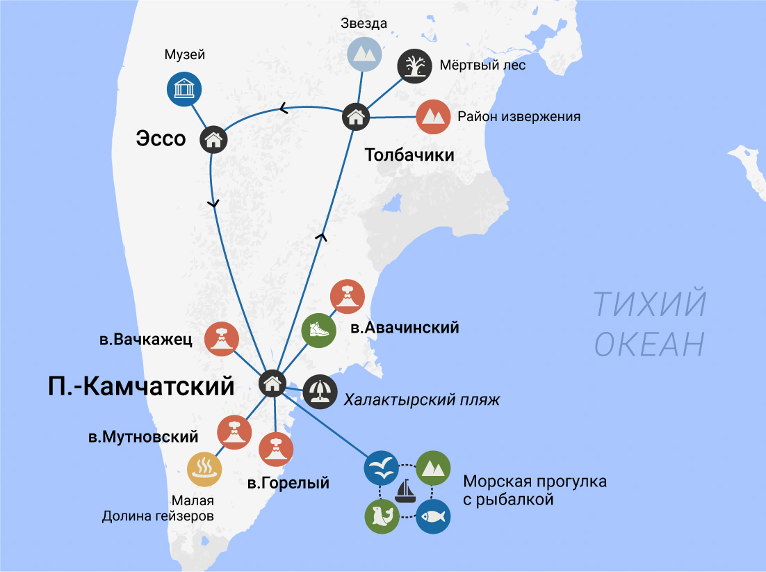 Вы увидите сердце Камчатки — её действующие вулканы, посетите завораживающие марсианские пейзажи, налюбуетесь изумрудными лугами с цветами, познакомитесь с местной фауной, и, быть может, вам удастся запечатлеть косолапого хранителя этого далёкого края.