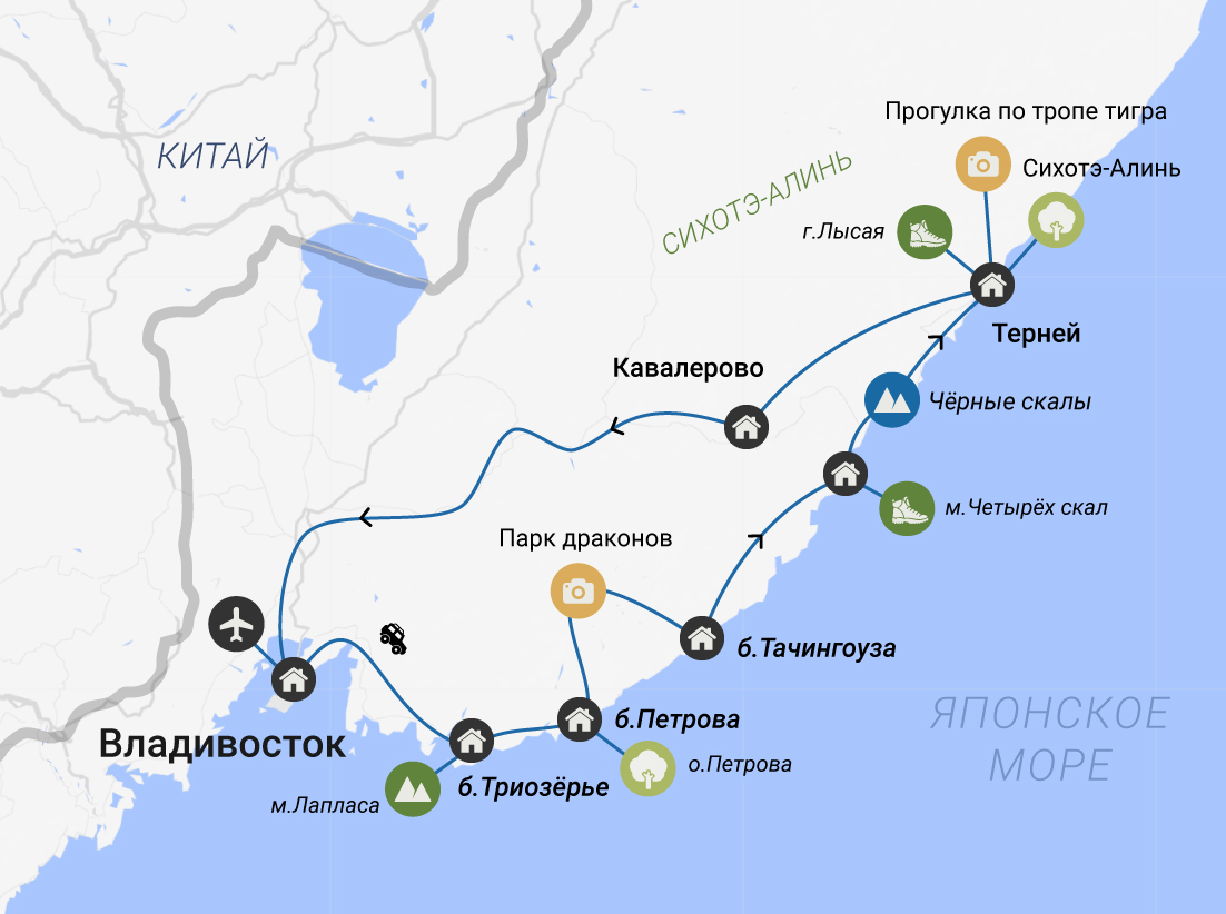В первой части программы вы познакомитесь с необыкновенным Японским морем, его зелёными островами, высокими мысами и космическими каменными останцами, парящими над водой. Во второй части — исследуете изумрудную тайгу, горы и быстрые реки с шумными водопадами.