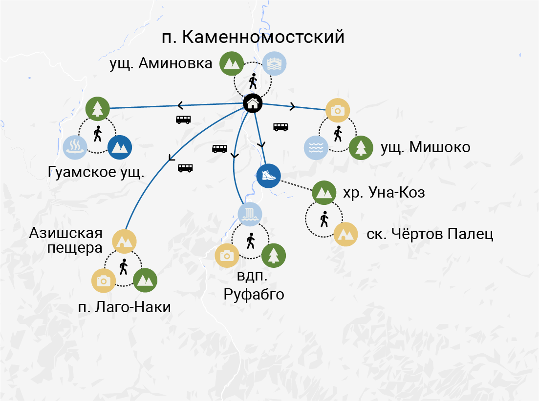 Все возможные варианты смотрите в разделе «Особенности путешествия». Обратите внимание, что все активности оплачиваются дополнительно. Вместо экскурсий вы можете просто остаться в гостинице и отдохнуть в тёплом бассейне или посетить местный рынок, чтобы купить адыгейских сыров.