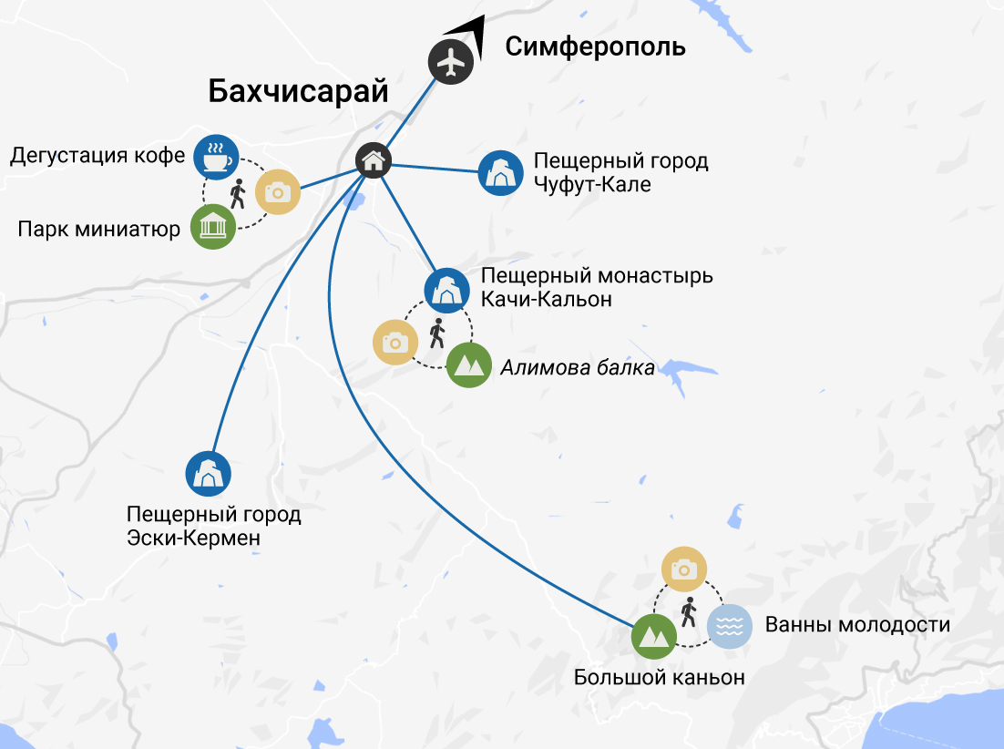 Мы будем исследовать закоулки старинных пещерных городов, разбираться в легендах Большого каньона и искать тайники разбойника Алима. Экскурсии будут интересны и детям, и взрослым: будем много гулять, знакомиться с историей Крыма, наслаждаться живописной природой, дышать ароматным горным воздухом и устраивать пикники в самых красивых местах. А ещё полакомимся восточными сладостями и заглянем в зоопарк.