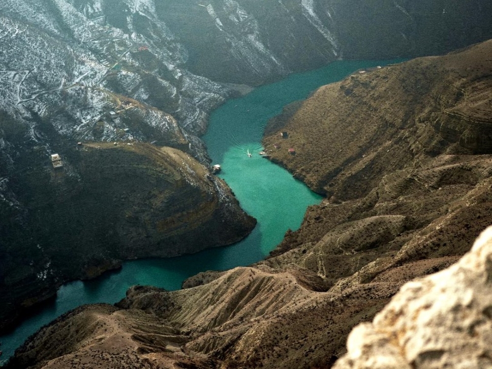 Для начала мы отправимся в Сулакский каньон — второй по глубине в мире. Бездна разверзлась аж на 1 920 м, но самые зоркие смогут заметить на её дне голубую полоску реки Сулак.