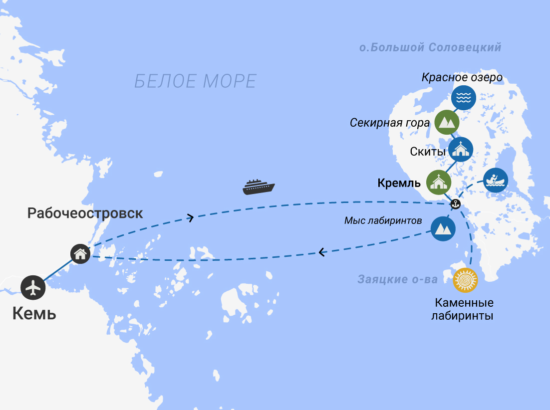 В этом путешествии вы увидите все главные достопримечательности легендарного Соловецкого архипелага: познакомитесь с архитектурным ансамблем Кремля, который включён в список Всемирного наследия ЮНЕСКО, побываете на авторской экскурсии по Секирной горе и соловецким скитам, сплаваете на Большой Заяцкий остров с таинственными 2000-летними лабиринтами. А на лодочной прогулке по просторному заливу Долгая губа понаблюдаете морских животных и продегустируете местные мидии.