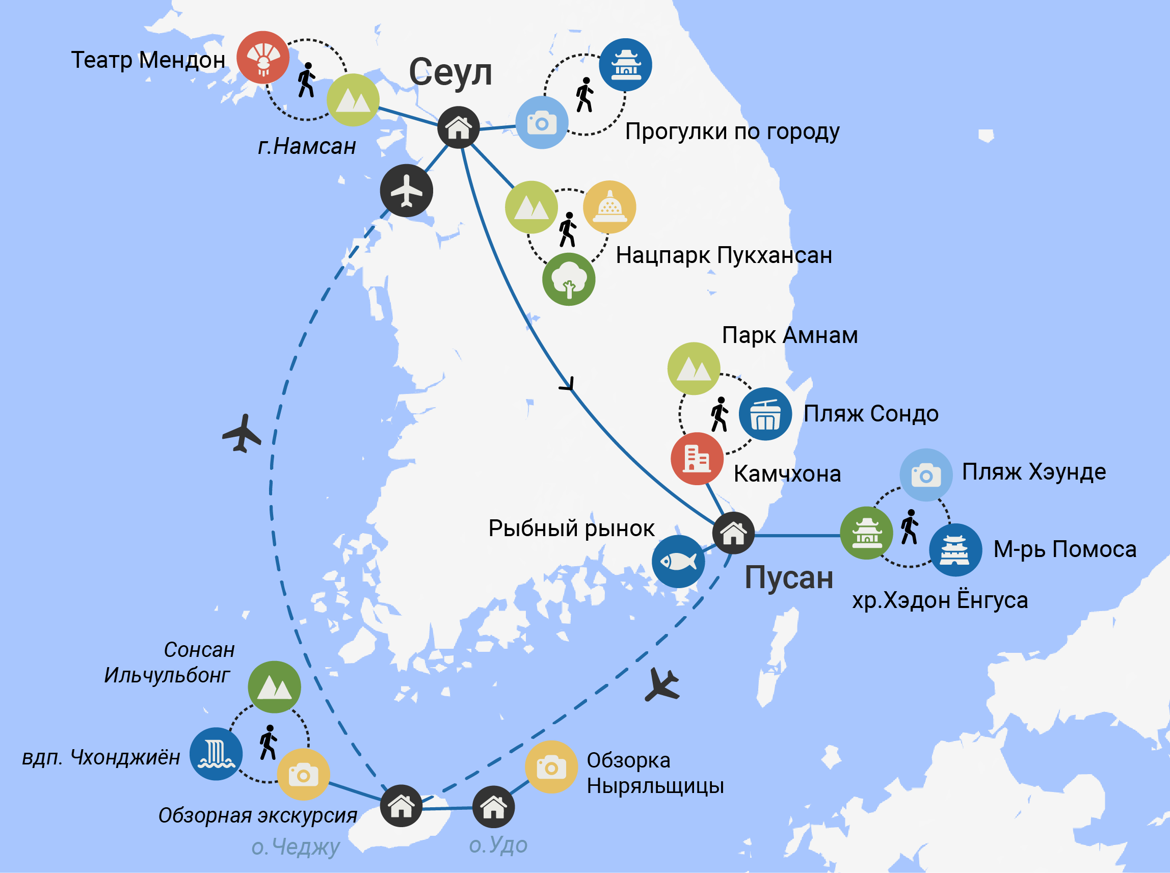 Мы отправимся на скоростном поезде и самолёте по маршруту Сеул — Пусан — остров Чеджу — Сеул.